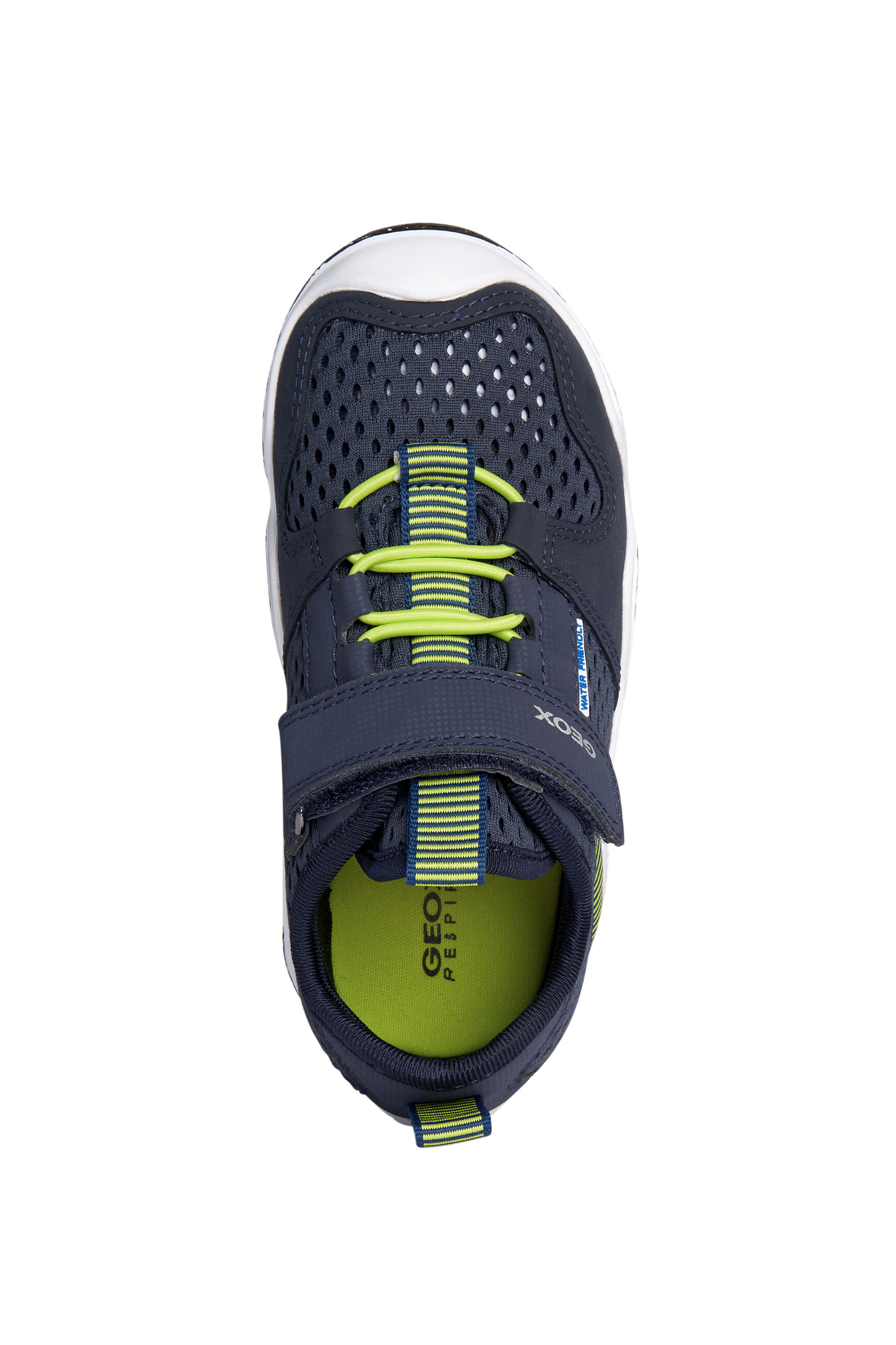 Cholewki wykonane są z wielowarstwowego siateczkowego materiału oraz skóry ekologicznej w kolorze granatowym z limonkowymi dodatkami