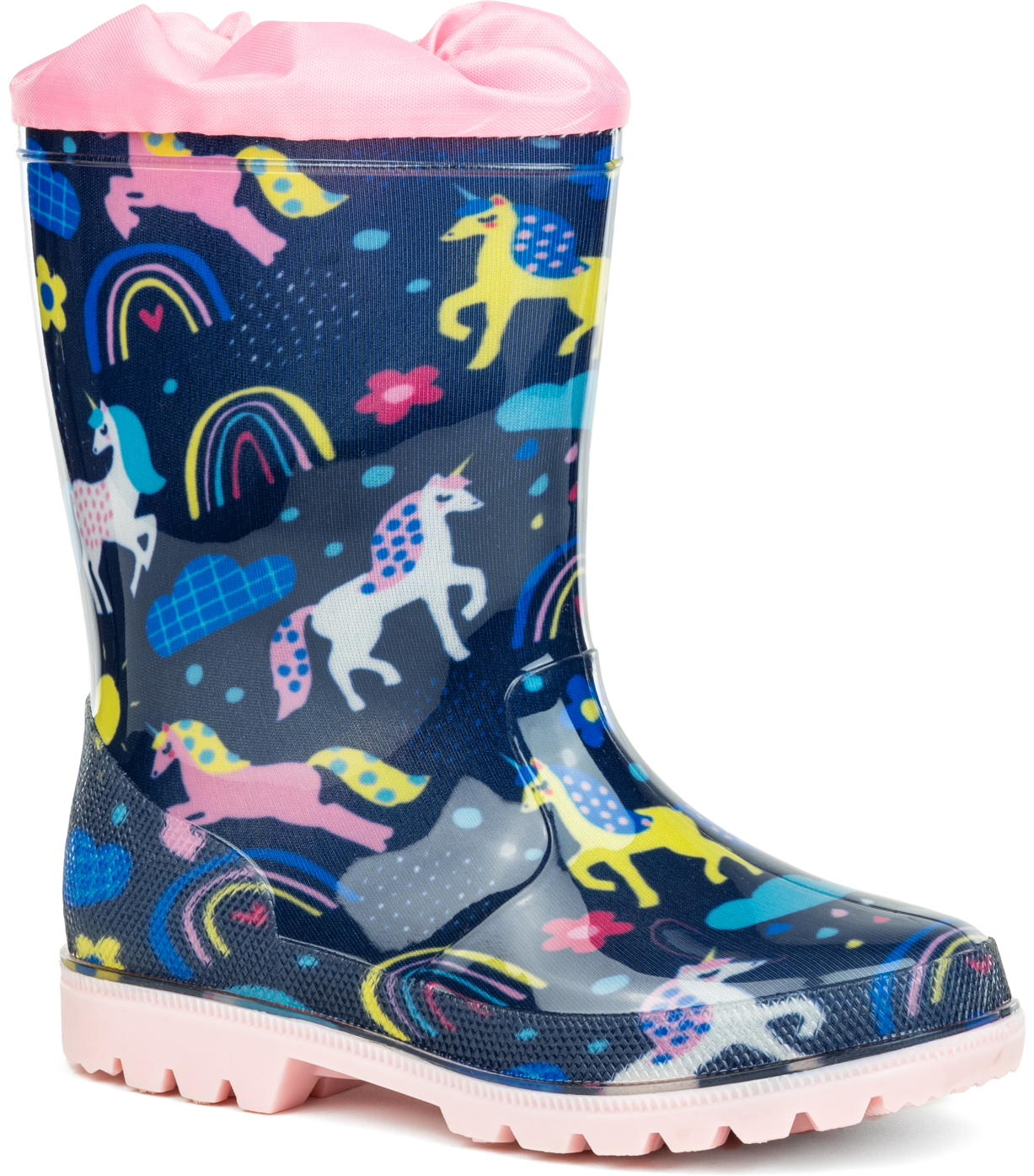 Kalosze dziewczęce marki Wojtyłko granatowo-różowe w jednorożce