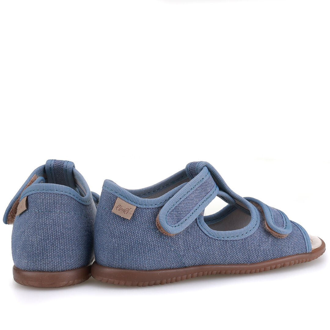 Kapcie dziecięce w formie otwartego sandałka z regulowanym paskiem i zapięciem na rzep.