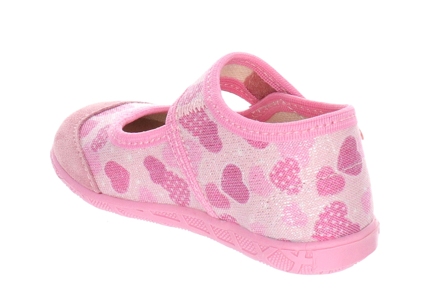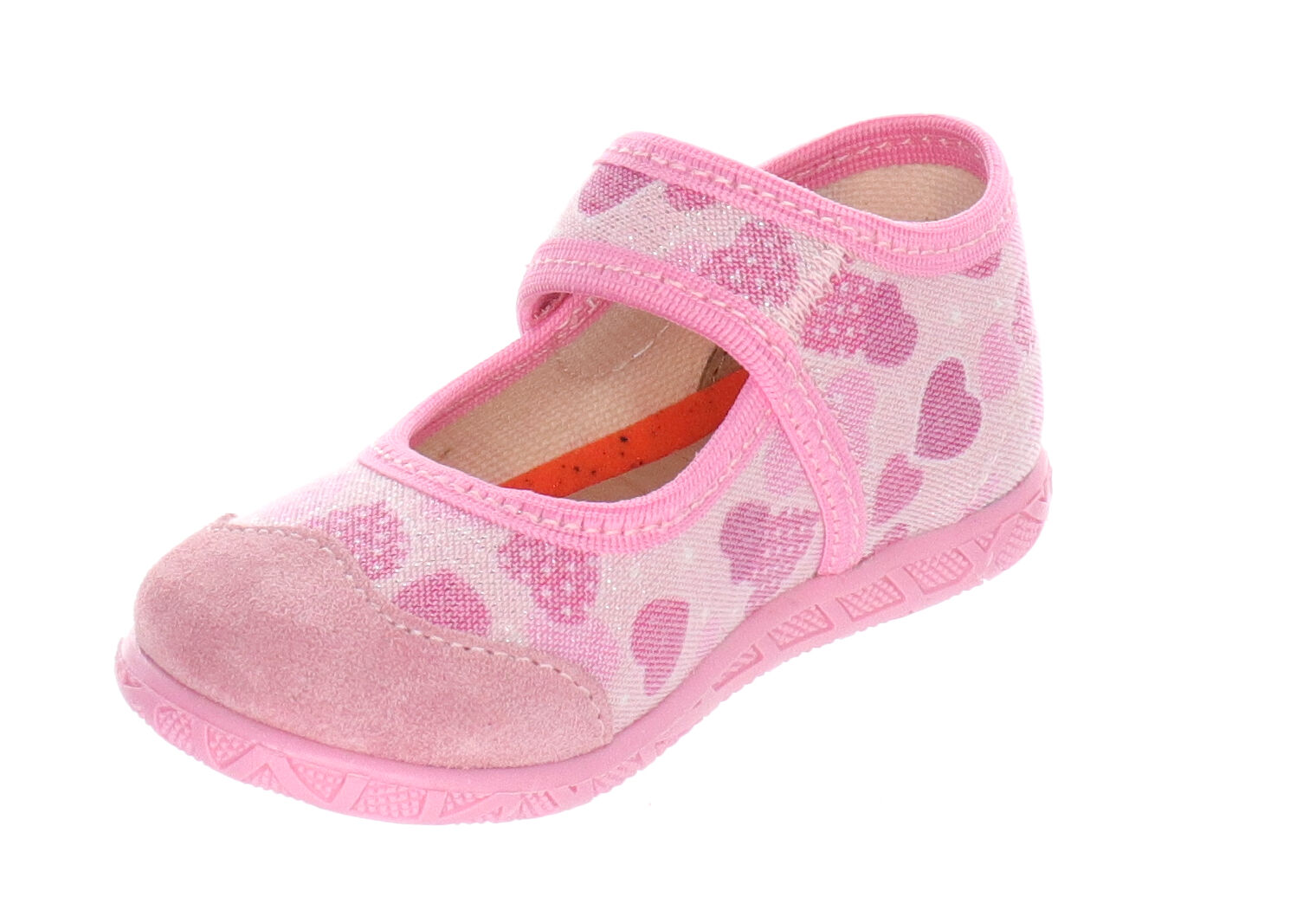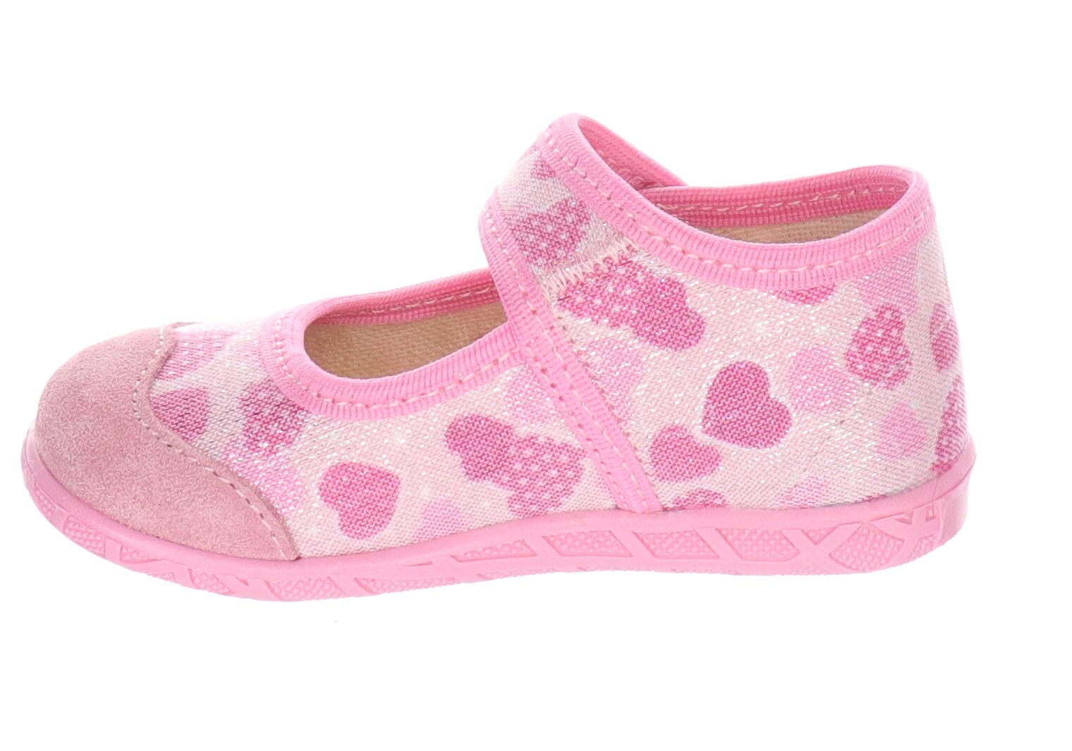 Miękkie, elastyczne kapcie dziecięce różowe w serca w formie balerinki są wykonane z przewiewnych tkanin bawełnianych oraz skóry naturalnej. Dzięki temu stopa dziecka oddycha i nie poci się nadmiernie, nawet po kilku godzinach chodzenia.