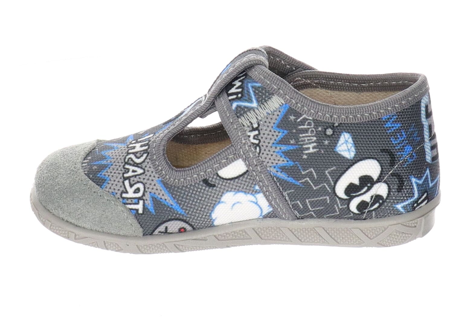 Miękkie i elastyczne kapcie dziecięce Milami 112 szaro niebieskie ze skórzaną wkładką wykonane z przewiewnych tkanin bawełnianych oraz skóry naturalnej