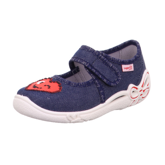 Granatowe kapcie dla dziewczynki z zabawnym motywem serduszka. wykonane z miękkich tkanin, które doskonale dopasowują się do stopy. Lekka, elastyczna podeszwa pozwala na naturalne toczenie się stopy. Ma ona również właściwości oddychające