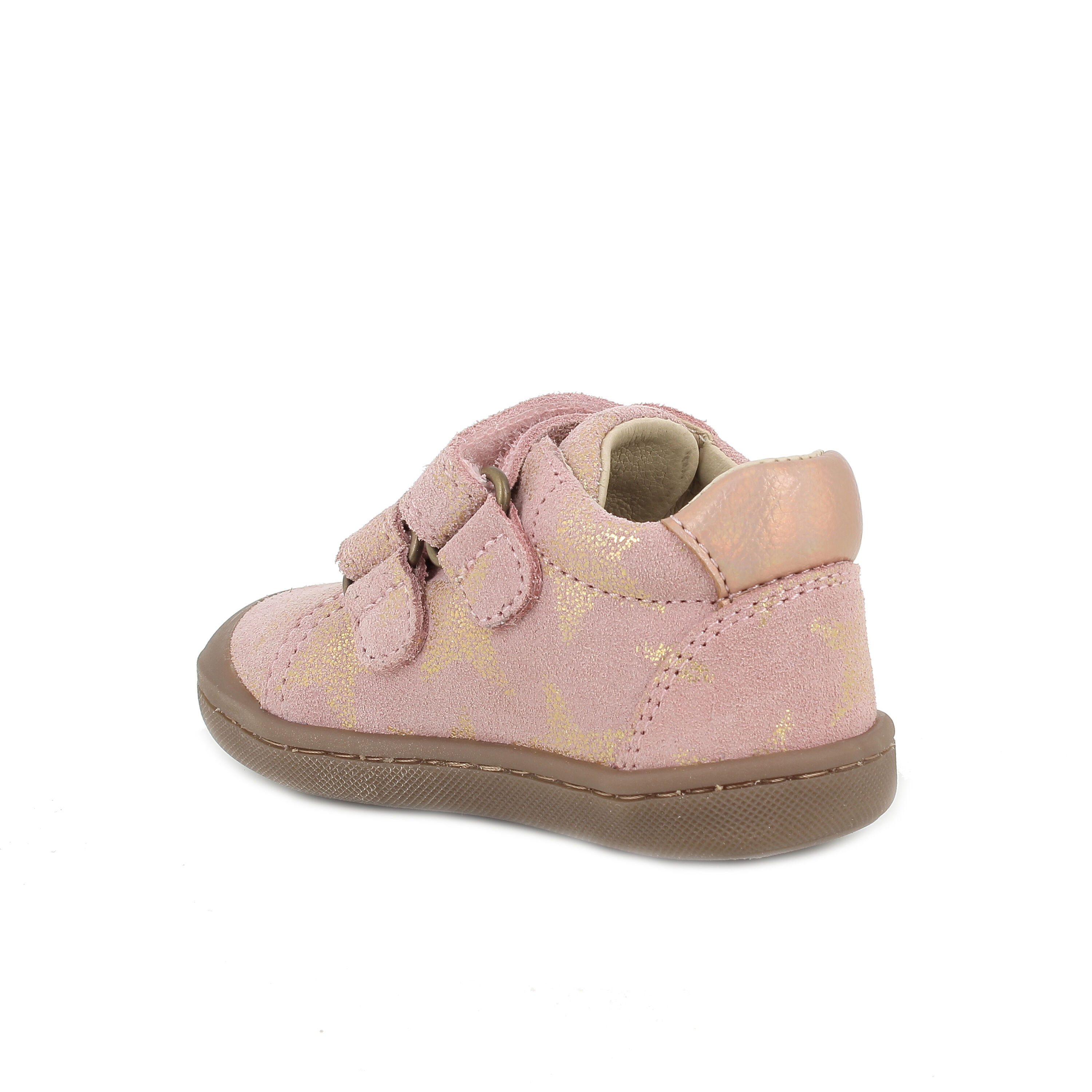 Lekkie i elastyczne półbuty dla dziewczynki w pastelowym różu ozdobione złotymi gwiazdkami