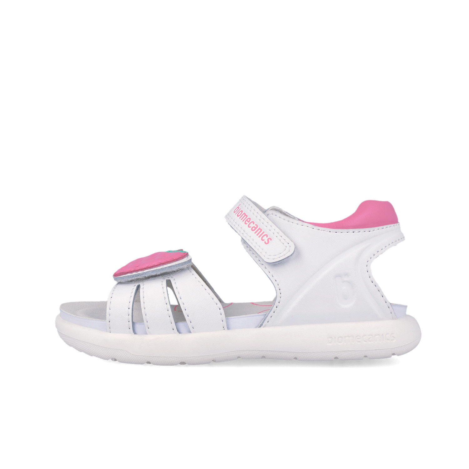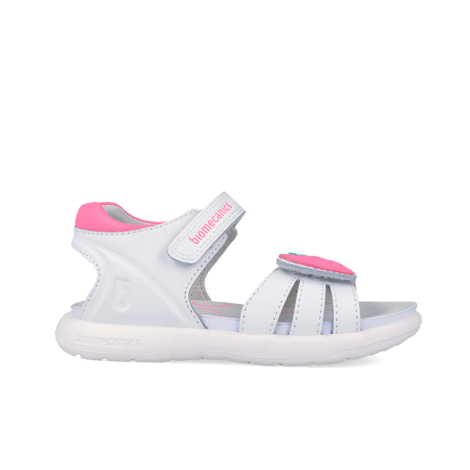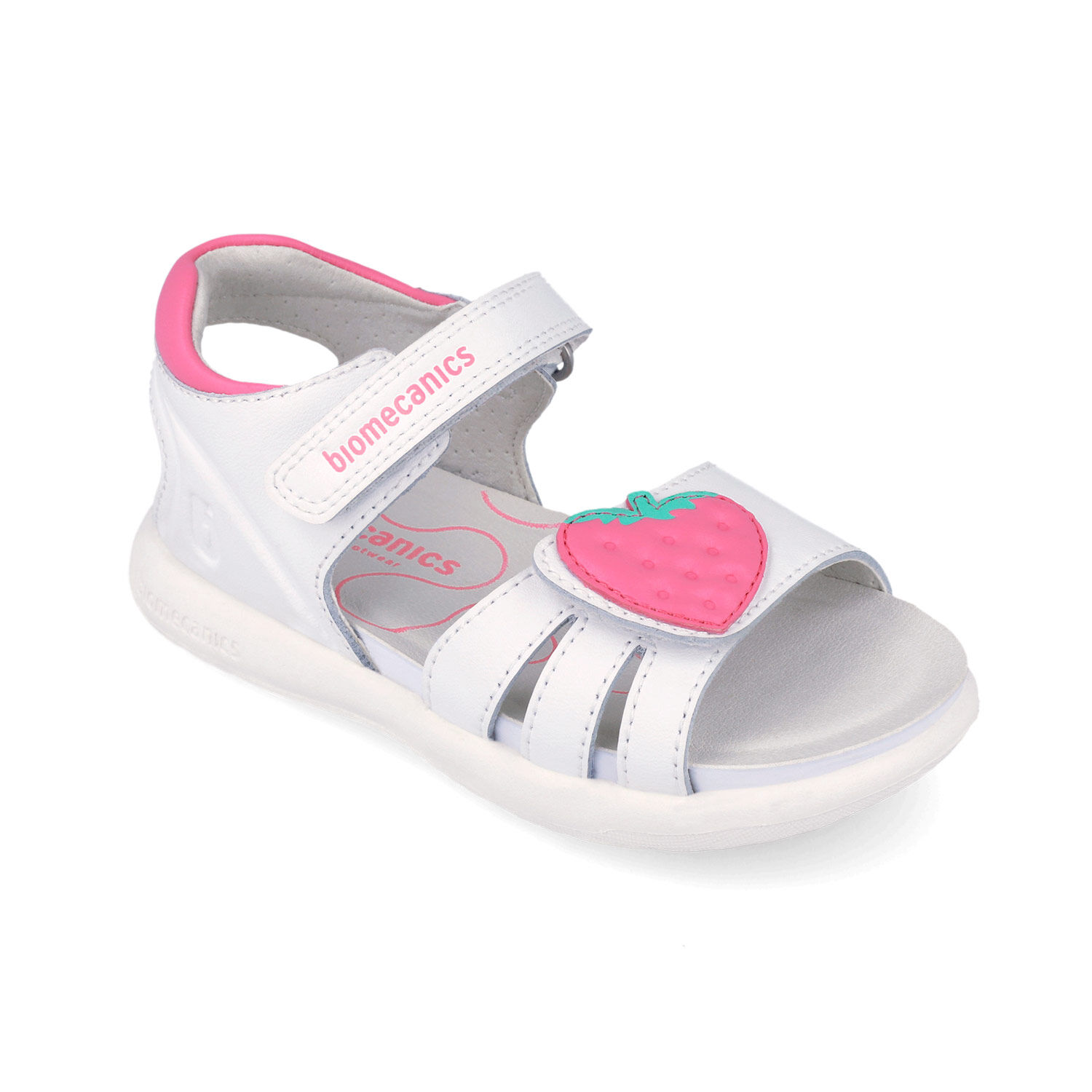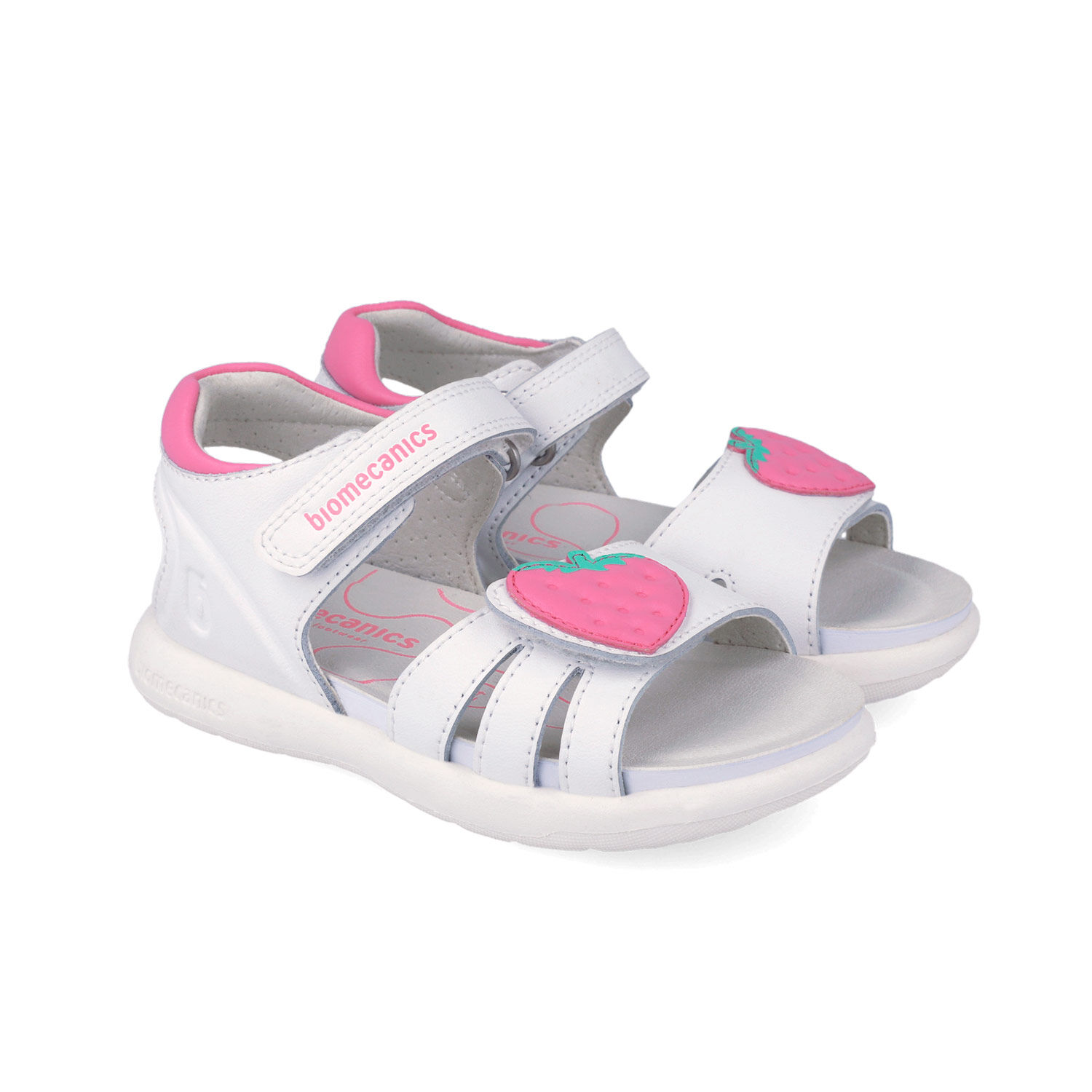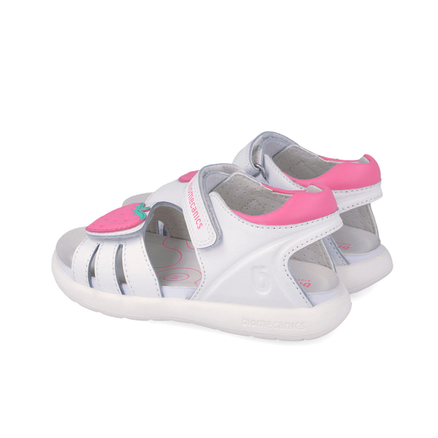 Sandały dla dziewczynki hiszpańskiej marki Biomecanics białe z truskawką