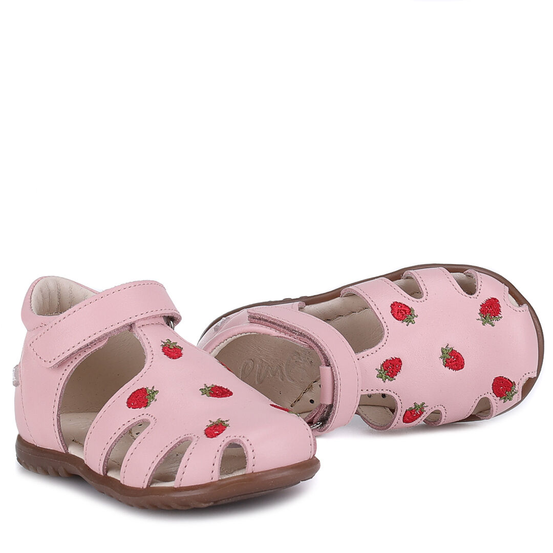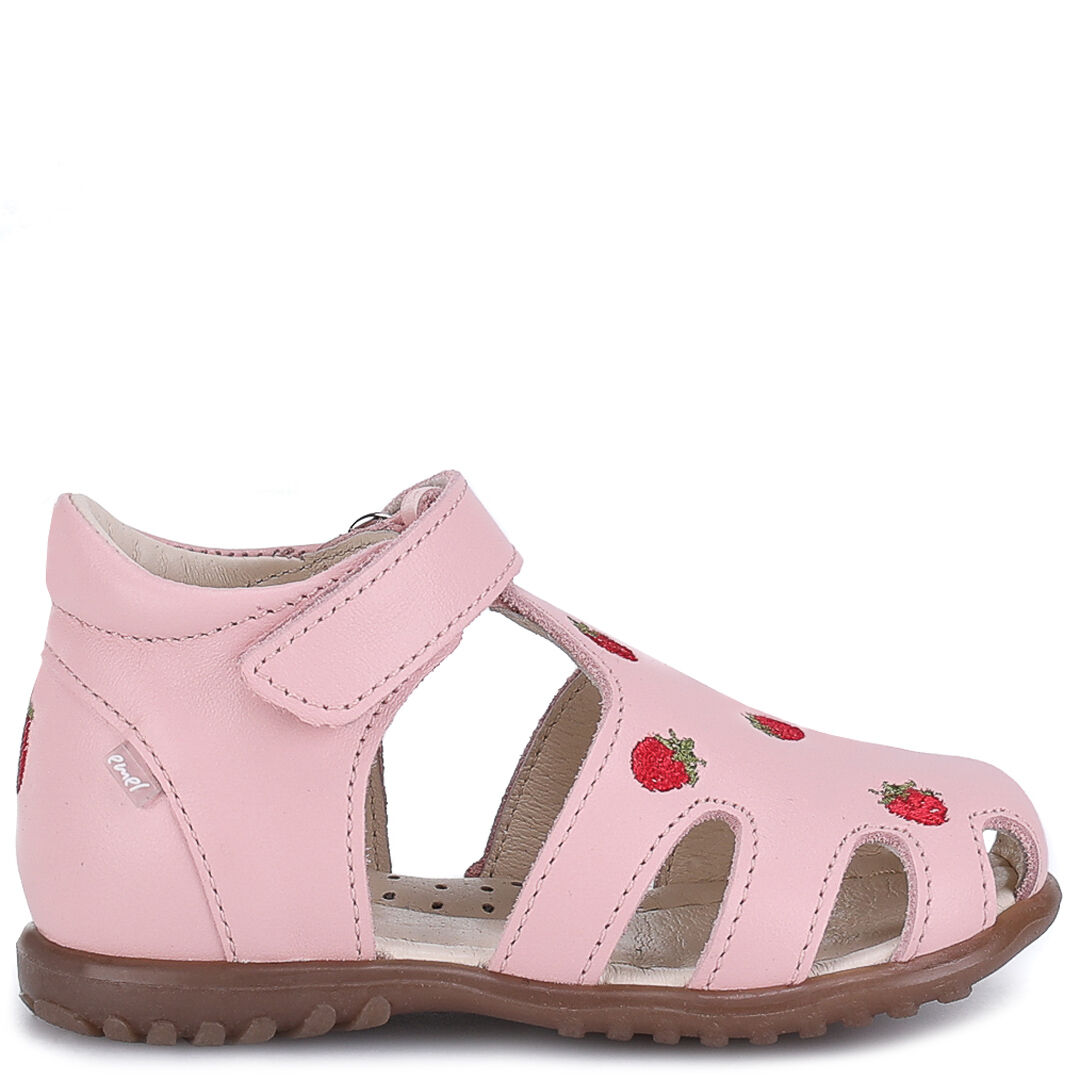 Różowe sandały dla dziewczynki Emel Palma roczki w poziomki z zabudowanym przodem i stabilnym zapiętkiem. Model należy do serii "roczki" opracowanej dla dzieci, które są na etapie nauki przemieszczania się w pionie. Wykonane z miękkiej skóry naturalnej licowej, wolnej od chromu, wyprawianej w sposób ekologiczny. Termokauczukowa podeszwa jest giętka i elastyczna, nie blokuje pracy stopy dziecka. Skórzane sandały dziecięce Emel Palma roczki w poziomki to buty profilaktyczne.