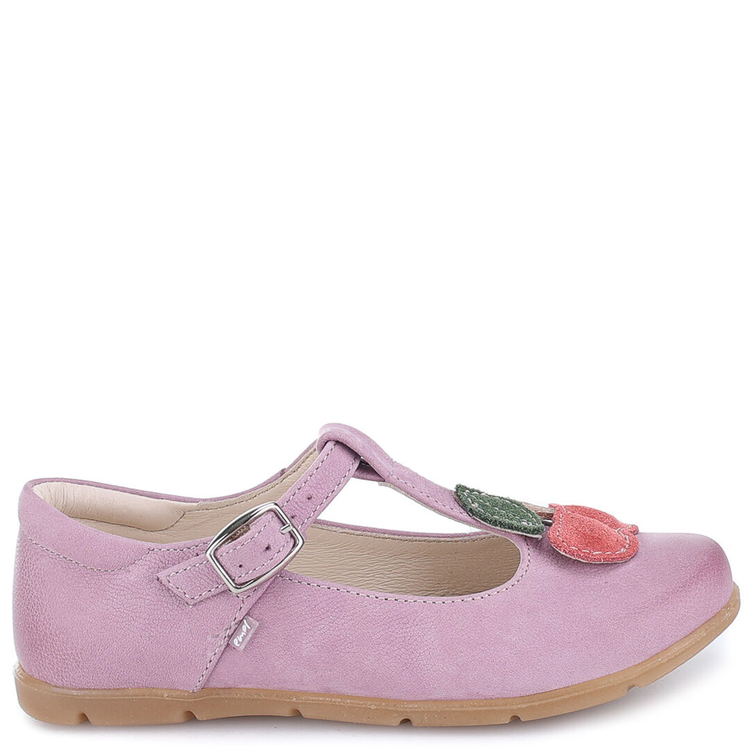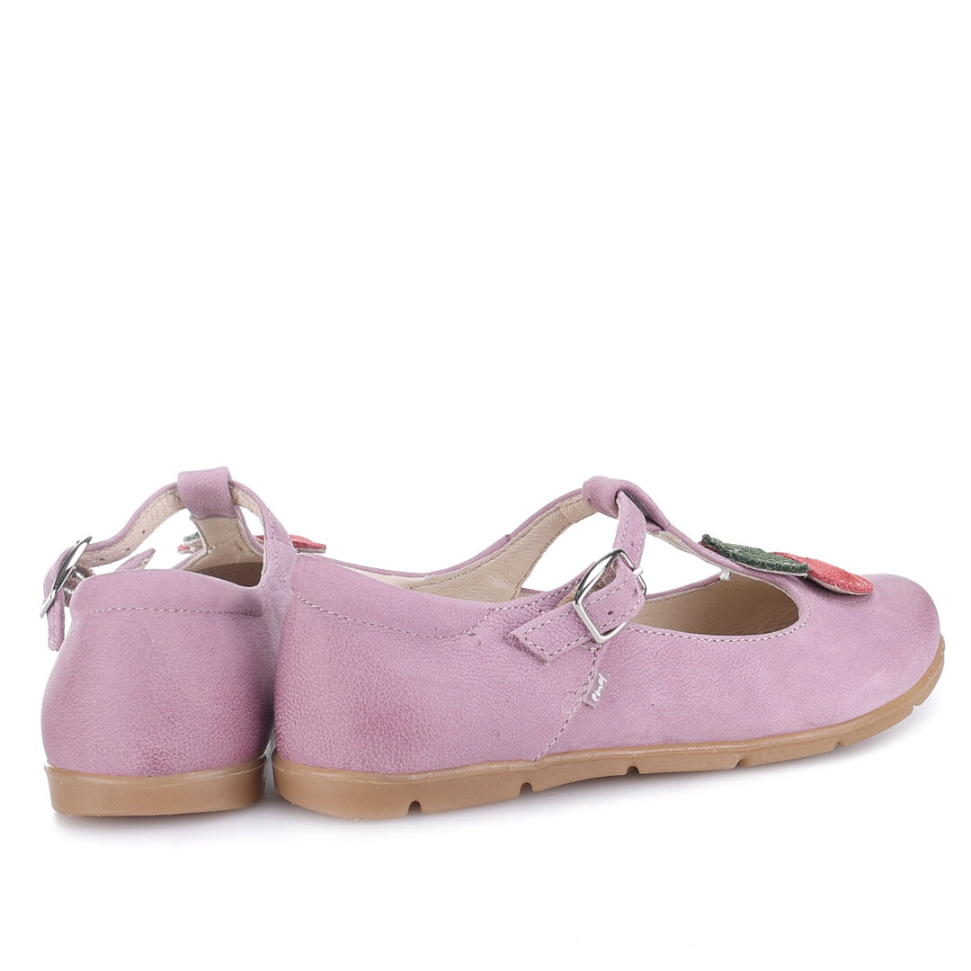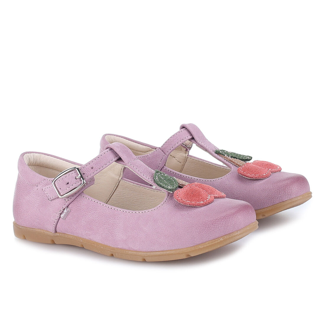 Wykonane są ze skóry naturalnej w kolorze pastelowego przecieranego różu, posiadają ozdobę w postaci uroczych owoców