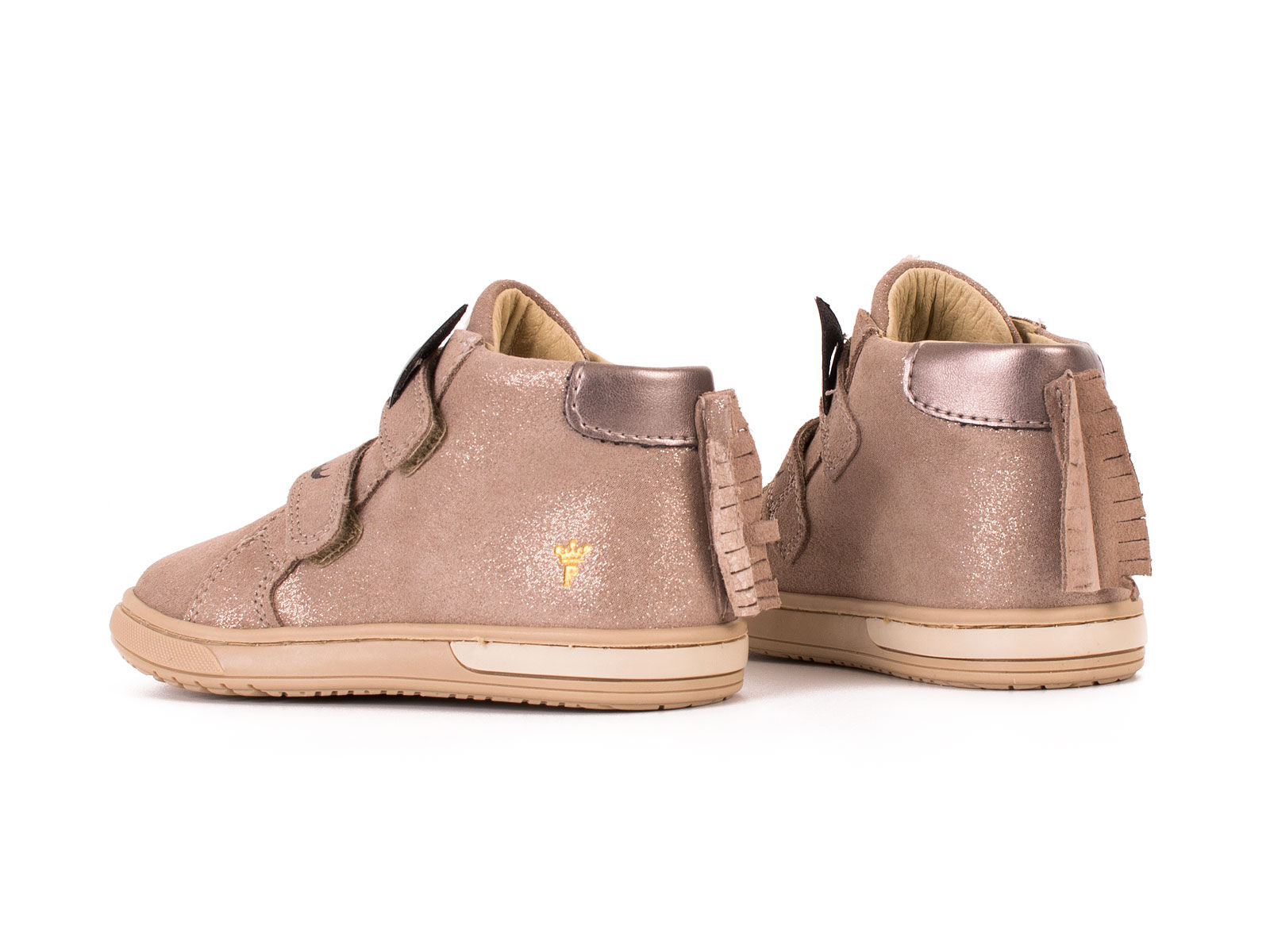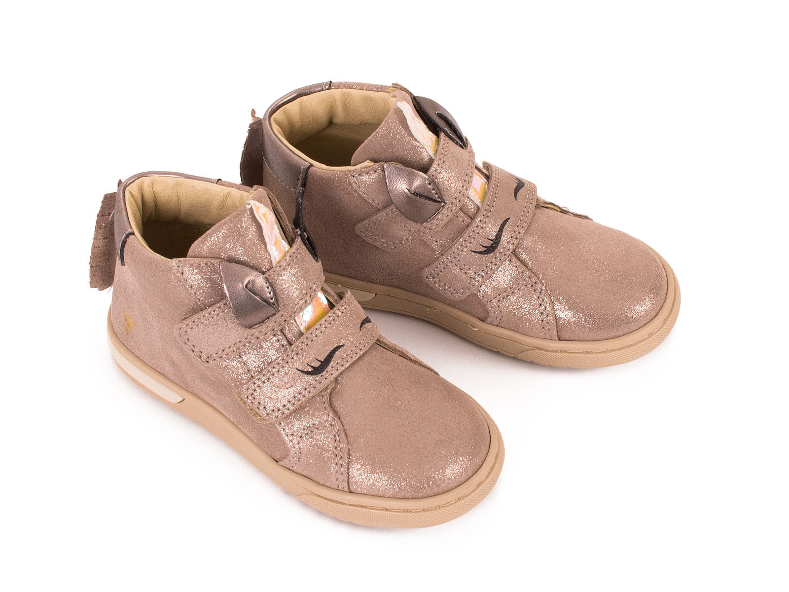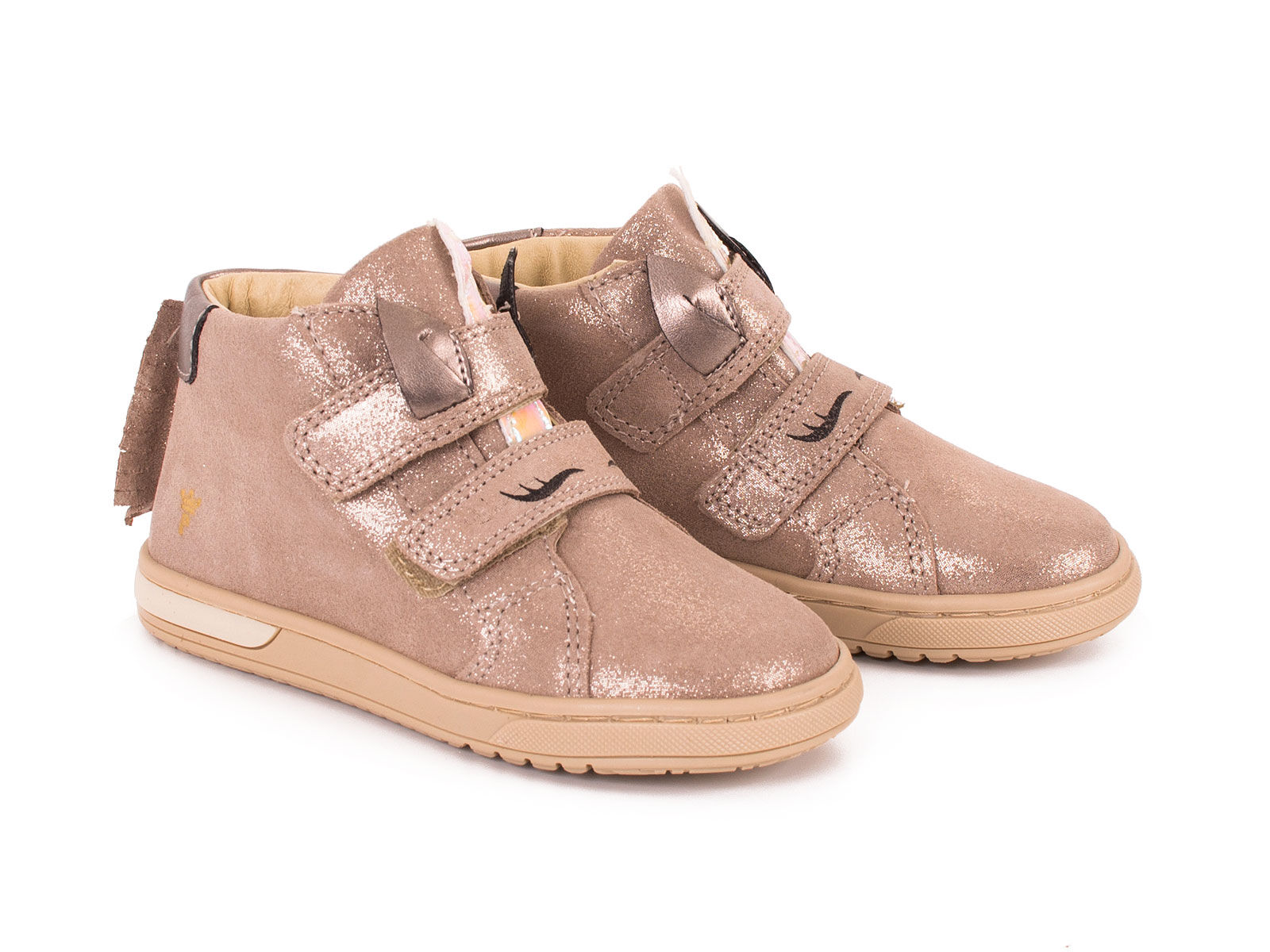Trzewiki dla dziewczynki wykonane z naturalnej skóry welurowej w kolorze beżu ze złotymi drobinkami. Motyw jednorożca dodaje dziewczęcego uroku
