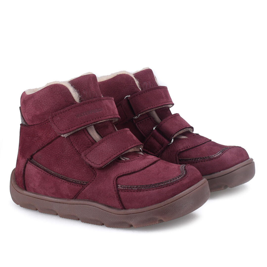 Skórzane bordowe trzewiki zimowe Barefoot Emel Atlas posiadają masywne ocieplenie z naturalnej wełny owczej, które jest przytulne w dotyku i chroni przed zimnem i zapewnia najwyższy komfort.