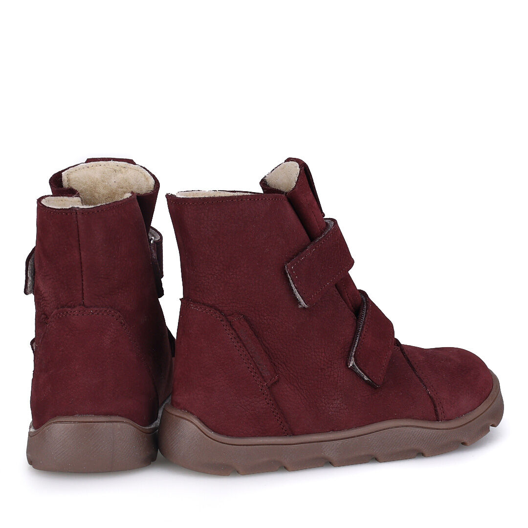 Skórzane bordowe trzewiki zimowe Barefoot Emel Montana posiadają masywne ocieplenie z naturalnej wełny owczej, które jest przytulne w dotyku i chroni przed zimnem i zapewnia najwyższy komfort.