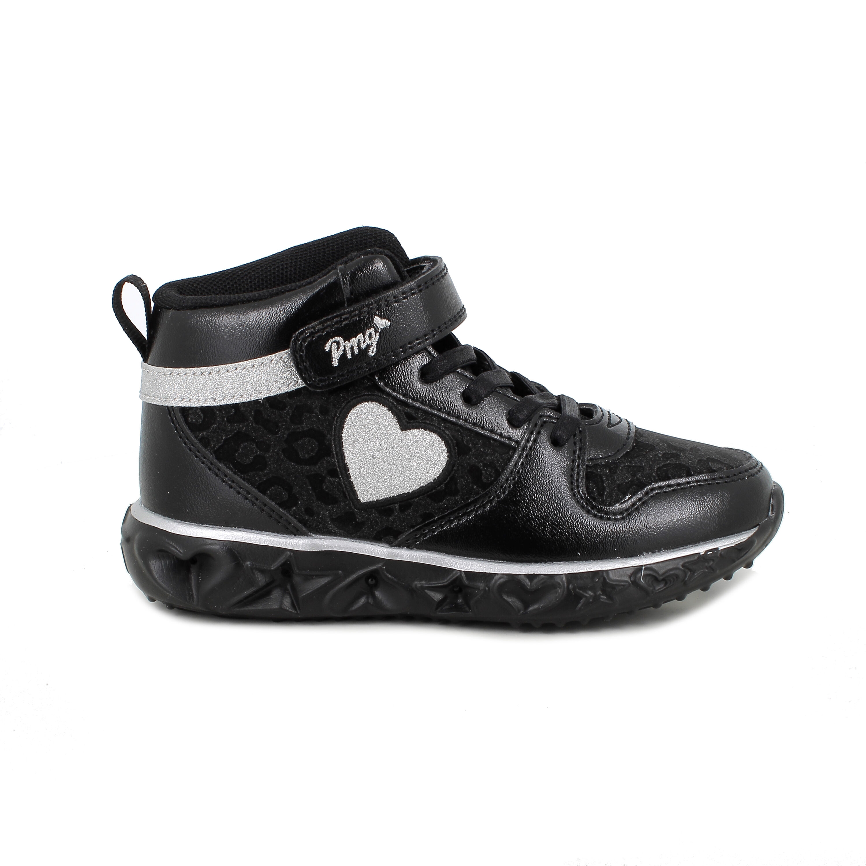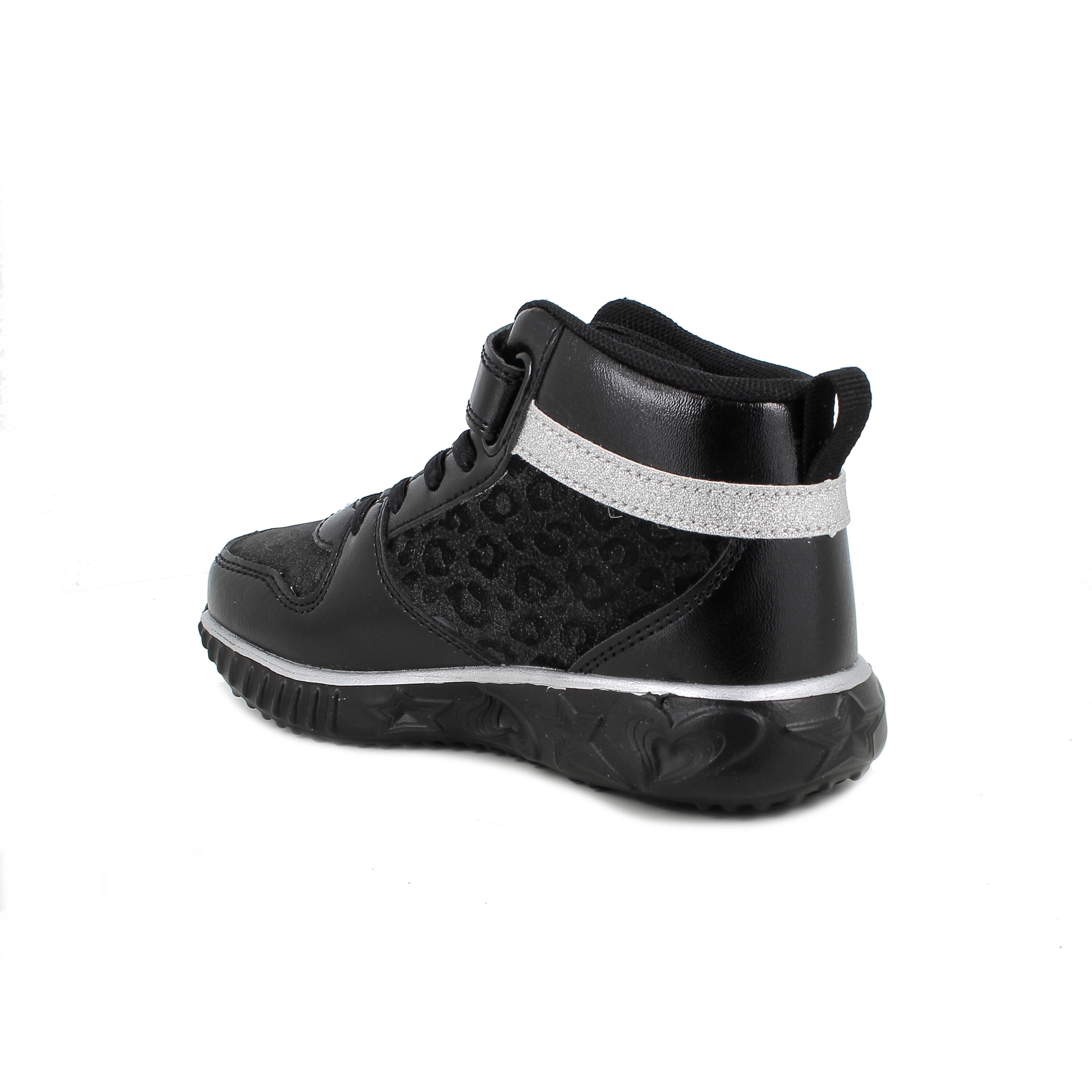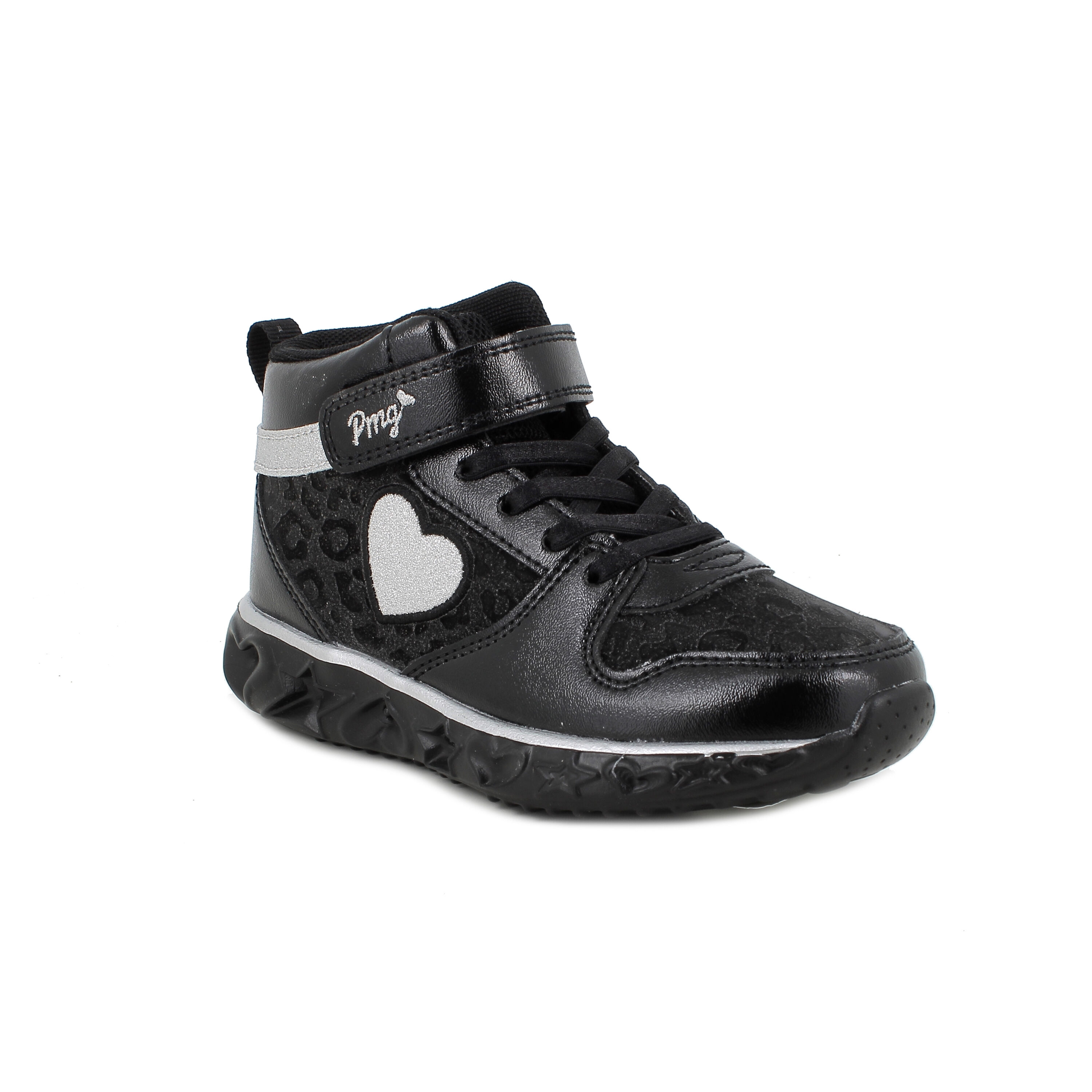 Czarne wysokie, sportowe buty dla dziewczynki ozdobione srebrnym sercem i światełkami w podeszwie