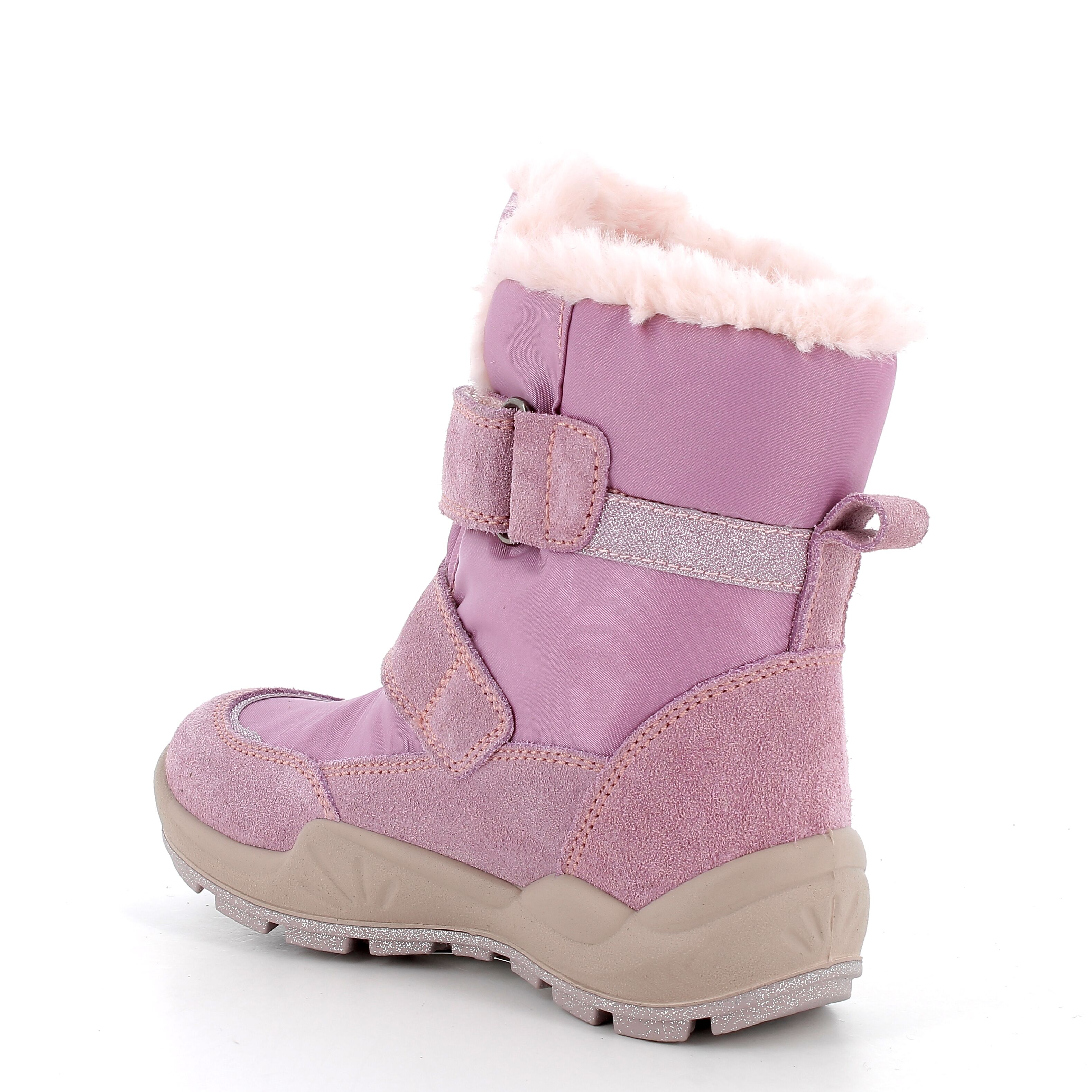 Mięciutki kożuszek wykańczający cholewkę i satynowe tkaniny połączone ze skórą nubukową dodają niepowtarzalnego uroku