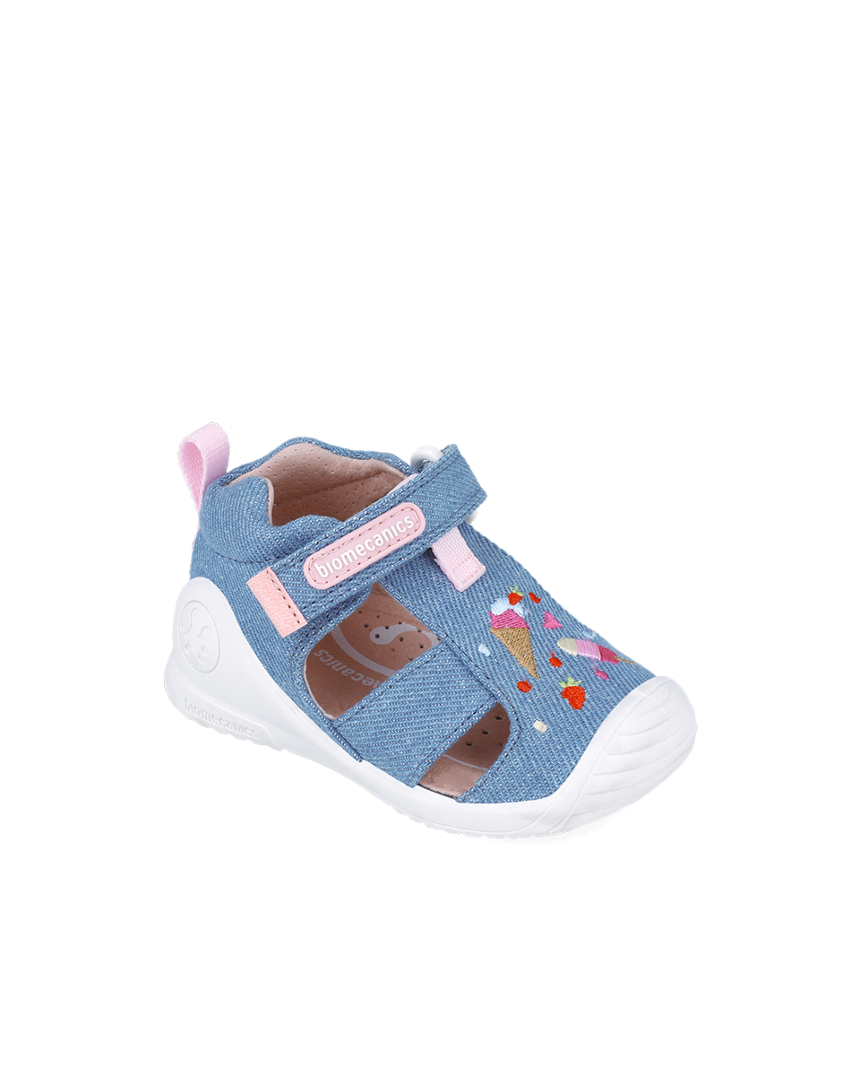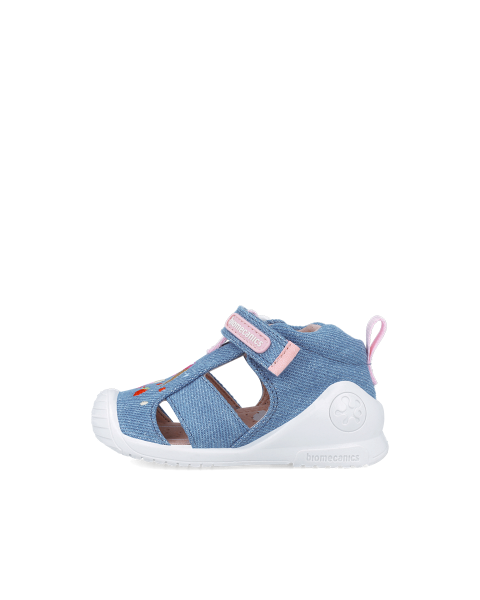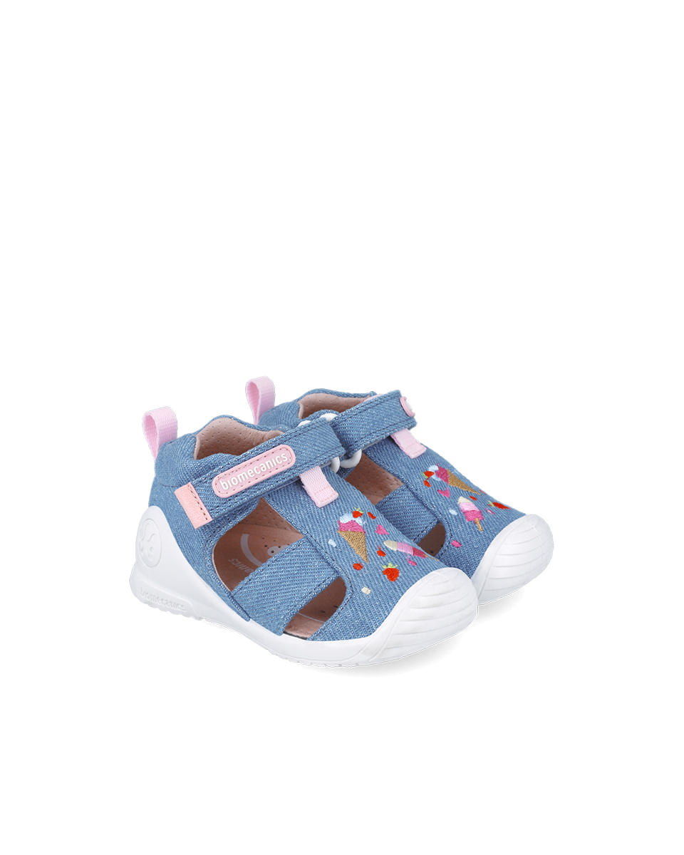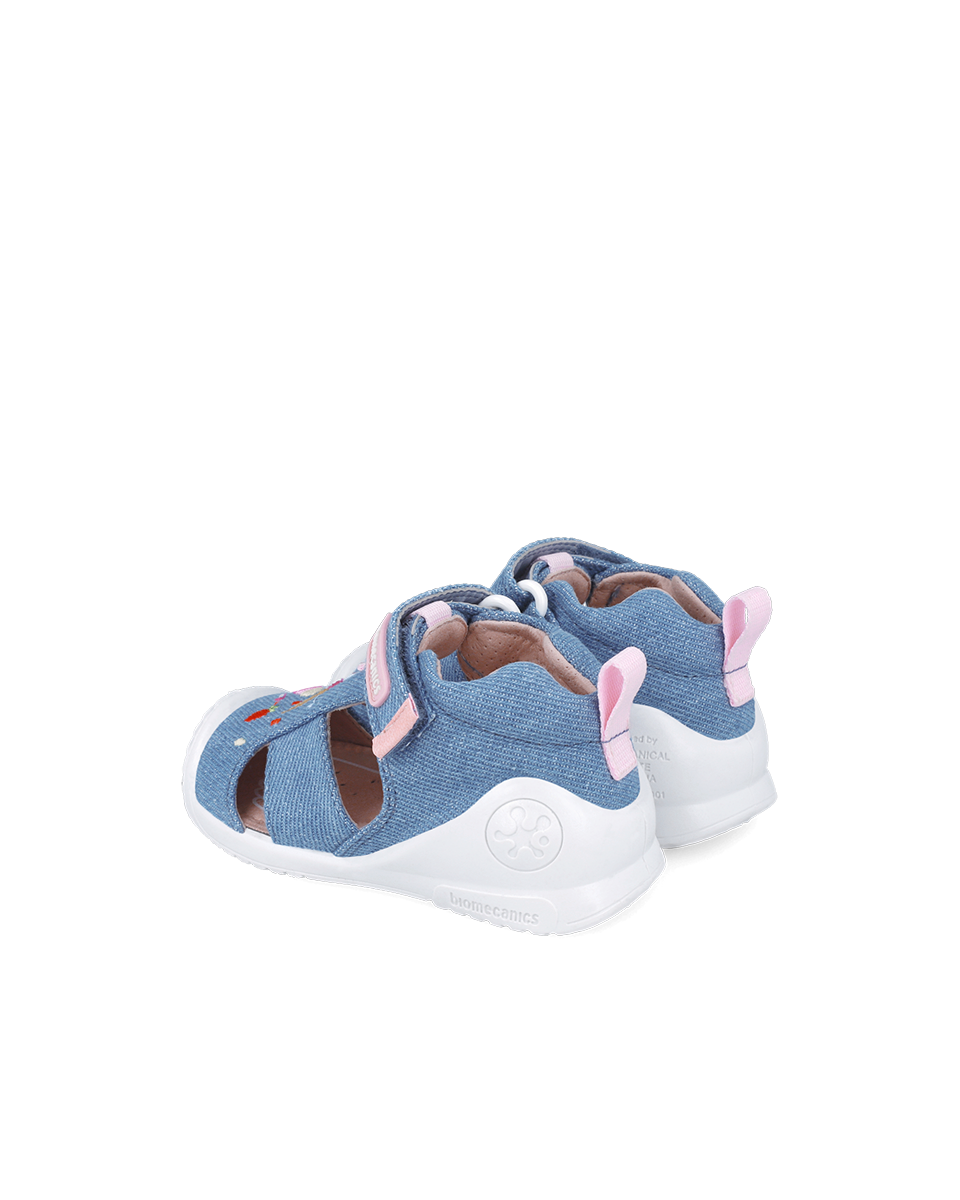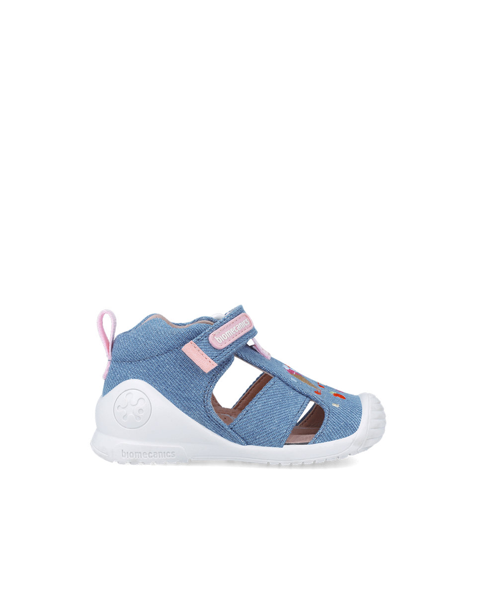 Tekstylne canvasowe sandałki dziecięce, których forma i kształt opracowane zostały z Instytutem Biomechaniki w Walencji