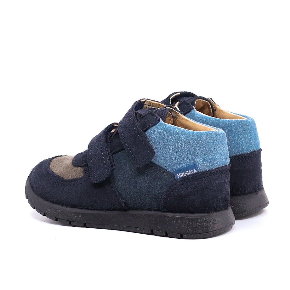 Trzewiki wykonane są z naturalnej skóry welurowej oraz licowej w kolorze granatu i brązu