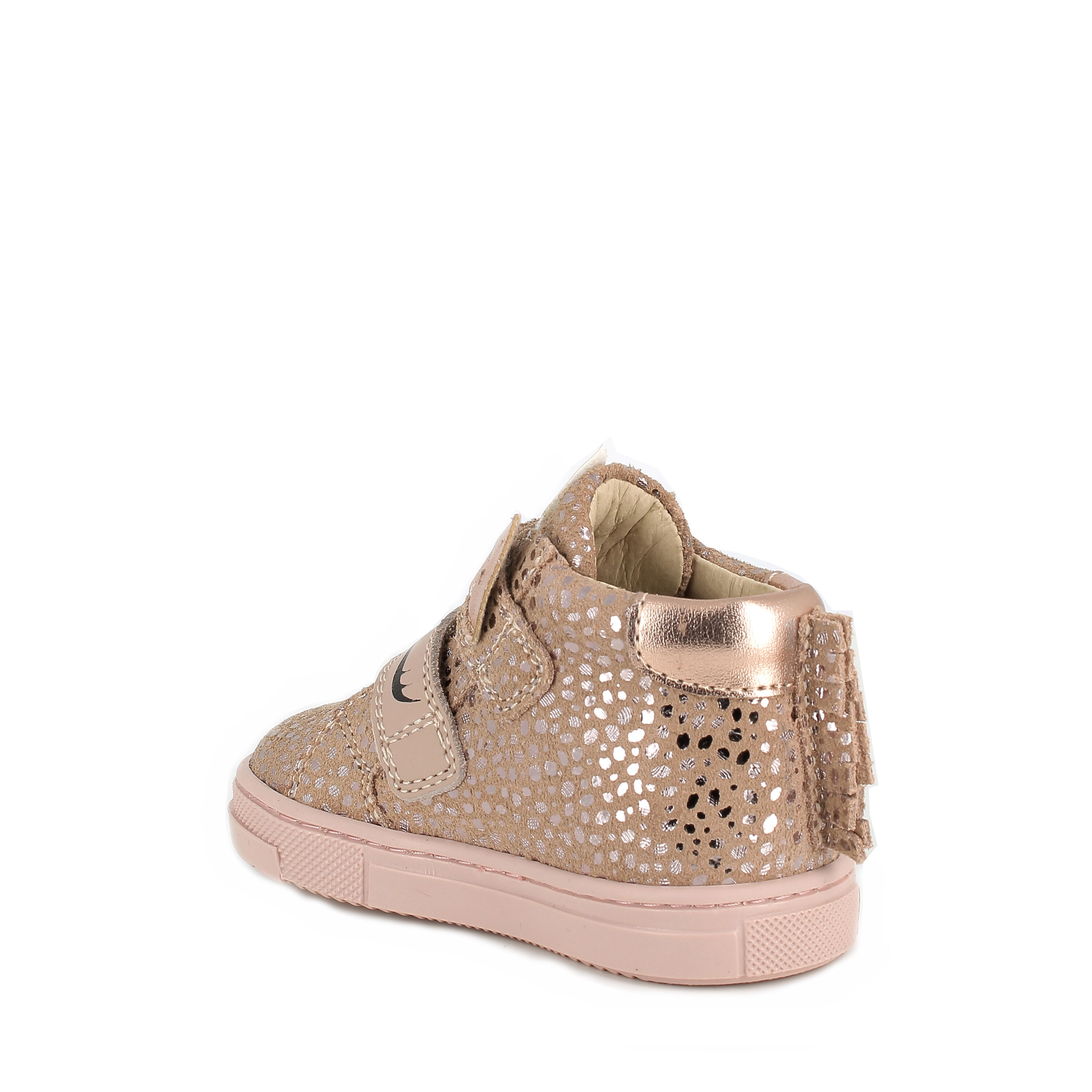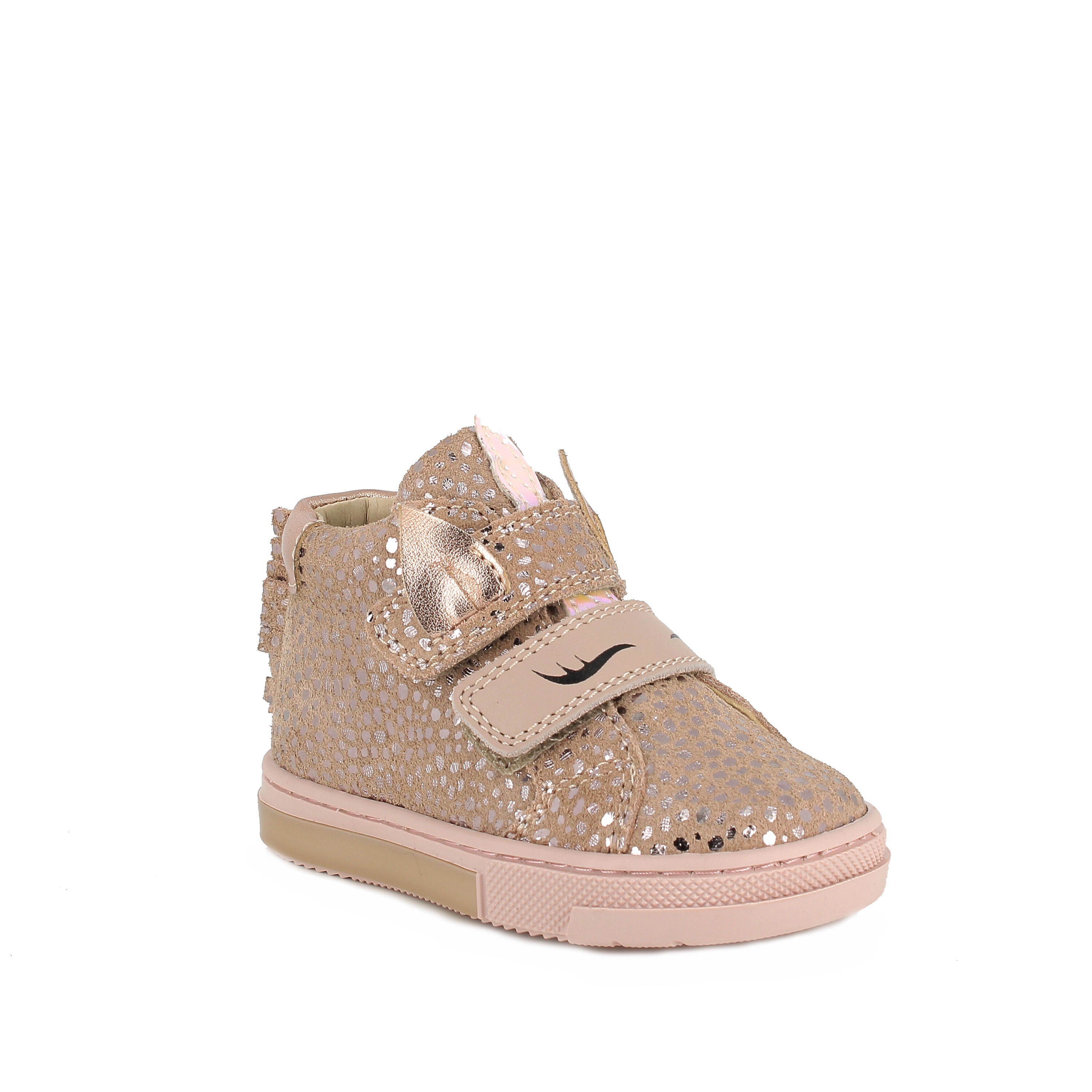 Trzewiki dla dziewczynki wykonane z naturalnej skóry welurowej w kolorze pudrowego różu ze złotym zdobieniem. Motyw jednorożca dodaje dziewczęcego uroku