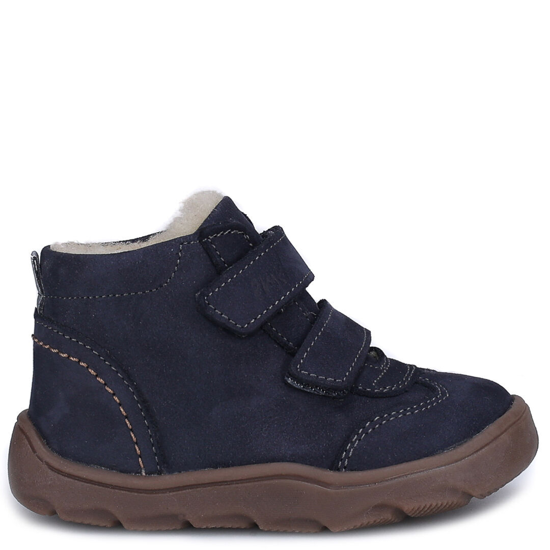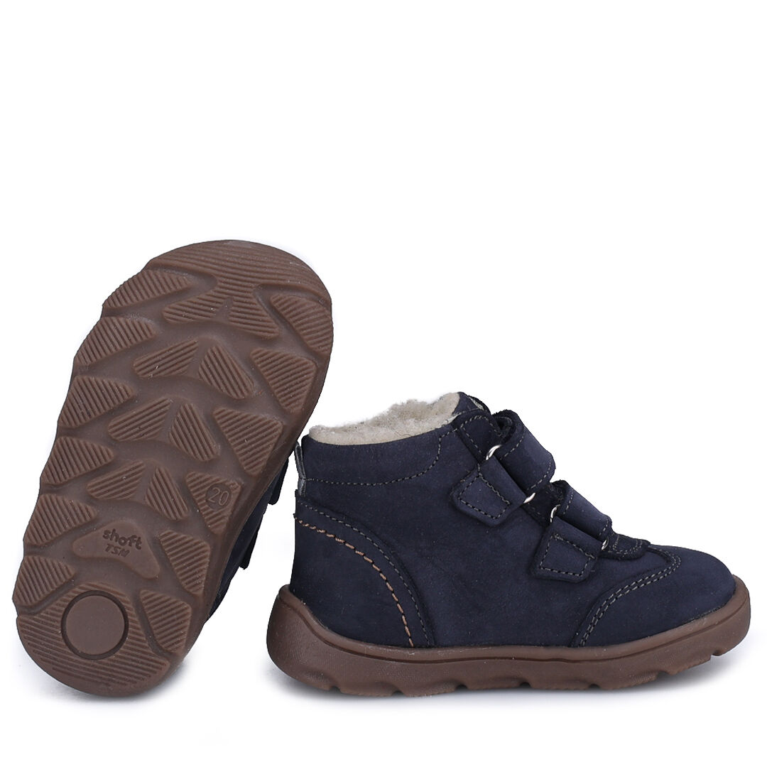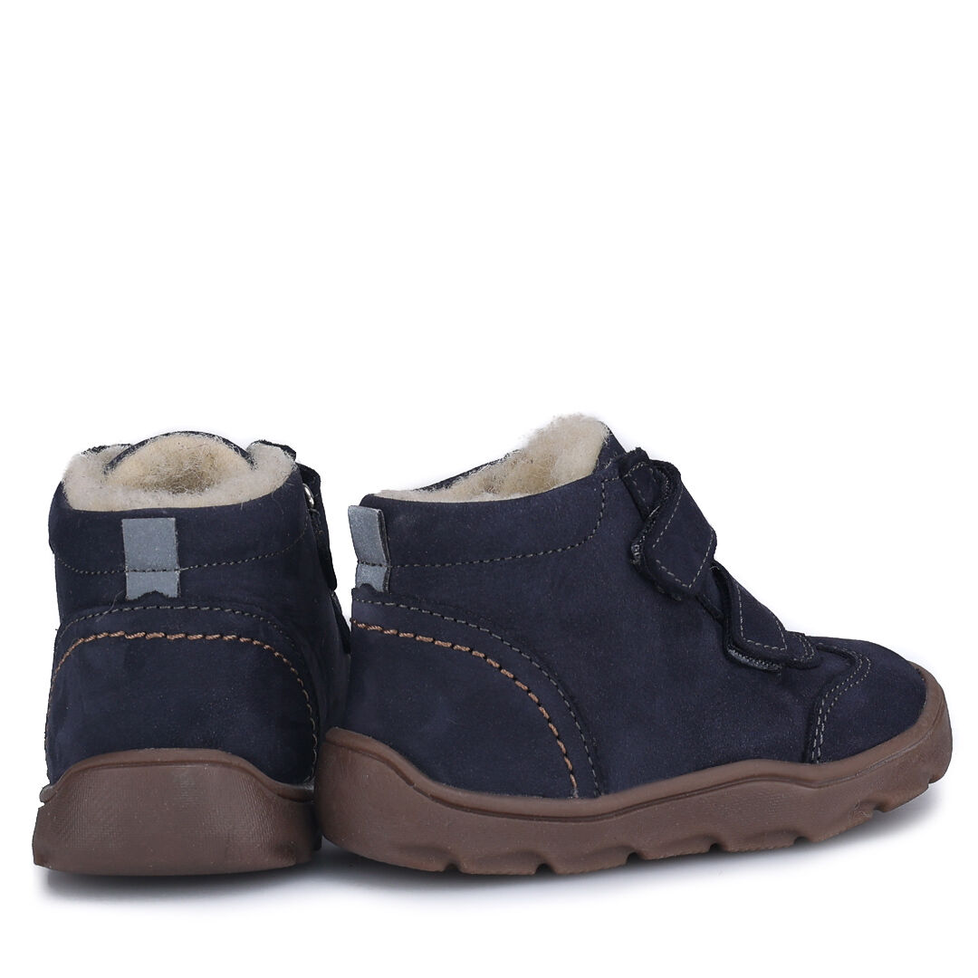 Granatowe traperki dziecięce zimowe Emel Atlas EV2725d-2 wykonane zostały ze skóry naturalnej nubukowej. Śródpodszewkę w obuwiu stanowi membrana Te-por, która chroni przed przemakaniem i zapewnia "oddychalność".